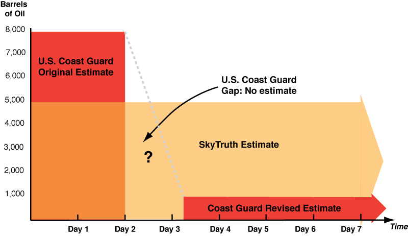 SkyTruth took a different approach. On April 27th (approximately Day 6 of the spill) they calculated the total volume of the spill based on satellite observations and divided by the amount of time that oil had occurred. This approach yields a conservative estimate that the spill is leaking approximately 5,000 barrels (or 210,000 gallons) of oil each day. It does not account for the oil that burned or has been cleaned up to that point, which, if accounted, for would make the daily estimate higher. This estimate is based on empirical evidence - the area and minimum thickness of the spill to be visible.